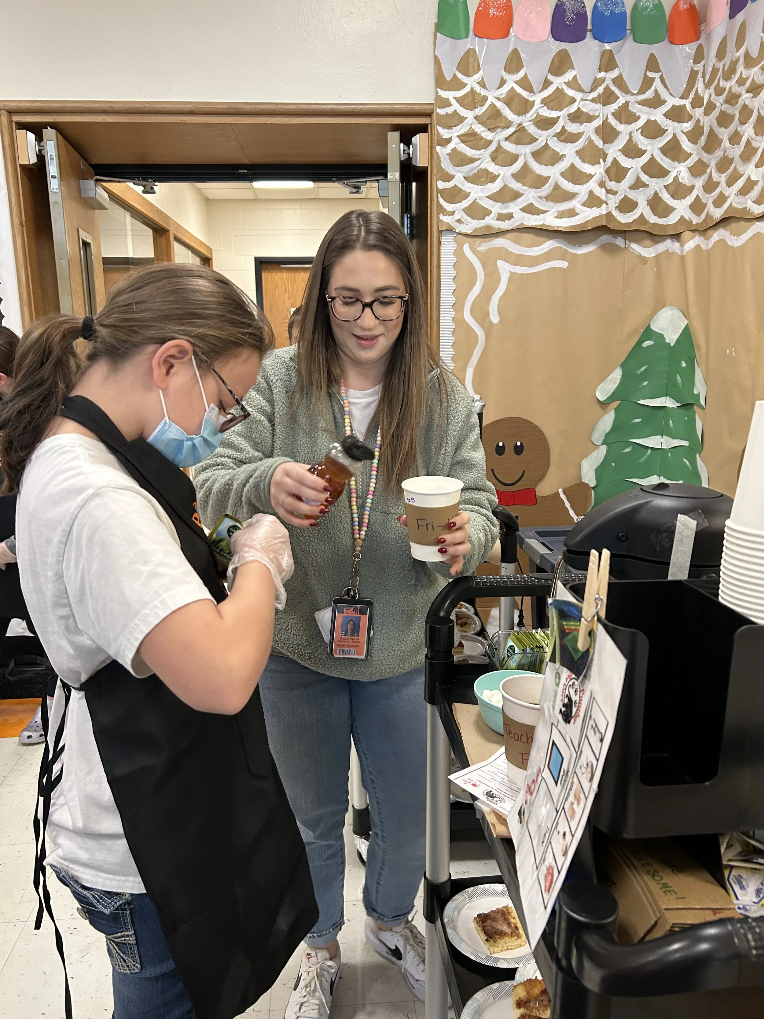 Ms. Wolfe has purchased 2 coffee carts, baking supplies and ingredients, coffee cups, and other supplies for this activity. On Thursdays the students prepare a dessert for the staff, and on Fridays the students, wearing gloves, a special apron, and name tags, sell the dessert and coffee/tea to the staff.
